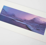 Camasunary Bay, Isle of Skye showcases a perfect vibrant snowy panorama for adding intrigue, drama, and rich colour to any space. As the sun rose, the clouds were thin enough to diffuse the light coming through, changing the surrounding colours from cold blues and greys to vivid pinks and purples, lighting everything up like a neon sign.