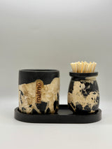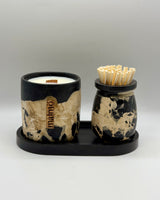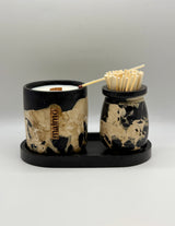 This Black, Natural & Beige Pot, Tray and Match Pot has a pretty natural 'Rock' effect overlay & comes in a variety of beautiful scents. Matches are included with this set & the bottom of the match pot can be used as a striker.