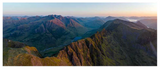 This breathtaking view captures the rugged ridgeline of the Aonach Eagach, bathed in the warm glow of sunset. The interplay of golden light and shadow across the jagged peaks and sweeping valleys creates a scene filled with depth and natural beauty, showcasing one of Scotland's most iconic mountain ranges.