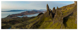 Capture the iconic beauty of the Isle of Skye with this stunning photo. This panoramic view features the legendary rock formations of the Old Man of Storr, perched high above the rugged Skye landscape. Beyond, the Cuillin Hills rise majestically, while the shimmering waters of the surrounding lochs and the distant mainland complete this breathtaking scene.