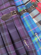 - Pleated front panel in the style of the kilt, with a traditional kilt buckle and silver tone thistle kilt pin