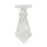 Let your little ones snuggle up with this Bashful Silver Bunny Soother. This beloved bunny has soft fur with long floppy ears and is hugging an un-stuffed square shaped soother all made from recycled fabrics.
