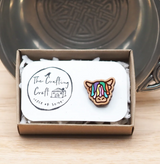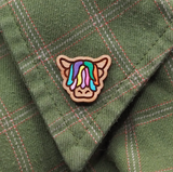 Add a touch of Scottish charm to your outfit with this vibrant, hand painted wooden highland cow pin badge. This multi coloured engraved design is made from solid cherry wood and mounted on a secure pin with a butterfly clutch back.