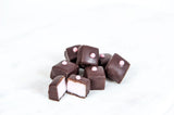 A rich strawberry fondant enclosed in a dark chocolate flavoured coating and topped with a strawberry flavoured pearl.